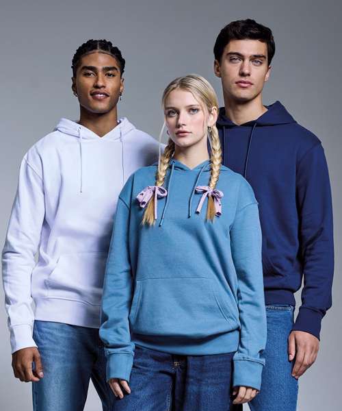 Soft hand feel. Double-fabric hood. Brushed inner fleece. Nickel-free, colour-matched eyelets and drawcord ends. Twin-needle detail. Cut and sew 1x1 ribbed cuffs and hem. Kangaroo pocket. Self-coloured neck size label.
