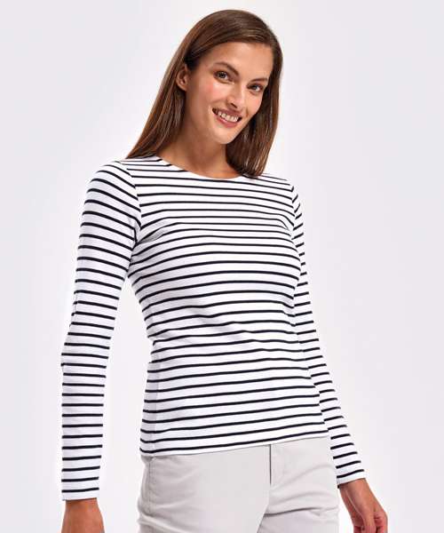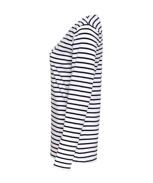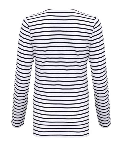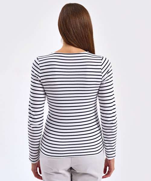 Soft feel fabric. Crew neck. Long sleeves. Double stitched arm holes and hem. Feminine fit. Product contains no branded neck label. Removable Kimble or looped garment tags. Inner seam label holds important product information on one label with a second label containing brand information which can be cut-away. Please note old stock may contain a fixed branded label.