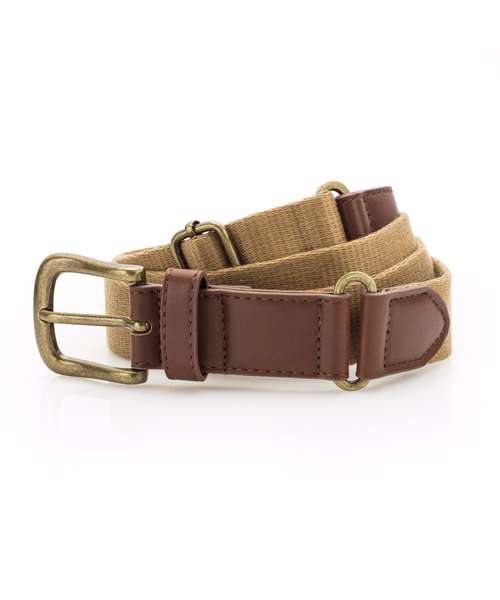 Canvas and faux leather belt. Belt strap and buckle are faux leather. 3 holes for belt buckle. Adjustable length. Product contains no branded neck label. Removable Kimble or looped garment tags. Inner seam label holds important product information on one label with a second label containing brand information which can be cut-away. Please note old stock may contain a fixed branded label.