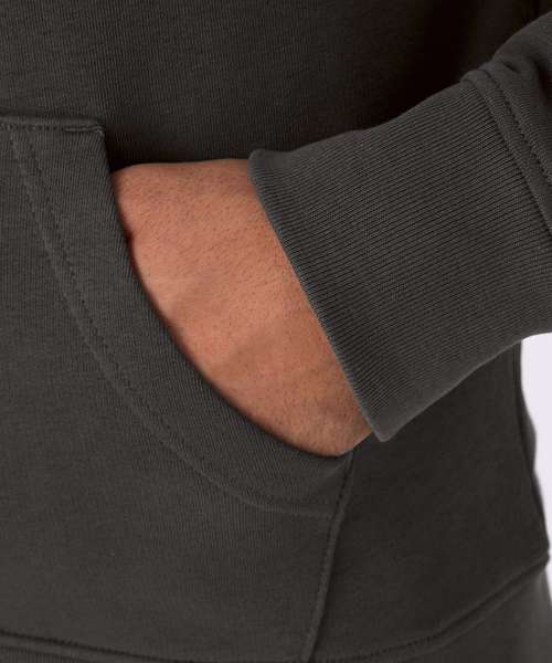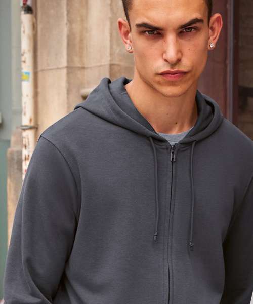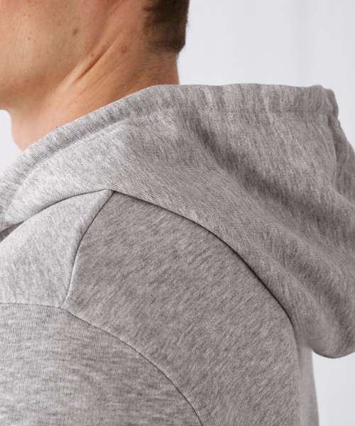 Trendy organic zipped hooded sweatshirt with retail fashion oriented look and feel. Strong styling with great fitting and perfect length. Side seams ensure the best fit and a masculine silhouette. Visible "Hi, I'm Organic" neck tab to highlight the organic value of the garment. Easy branding solution - B&C No Label Solution. Inside single Jersey halfmoon in back to allow easy branding personalisation. Qualitative herringbone neck tape. Retail like features: covered metal zip, single Jersey lined hood, qualitative herringbone neck tape and fashionable drawcord.