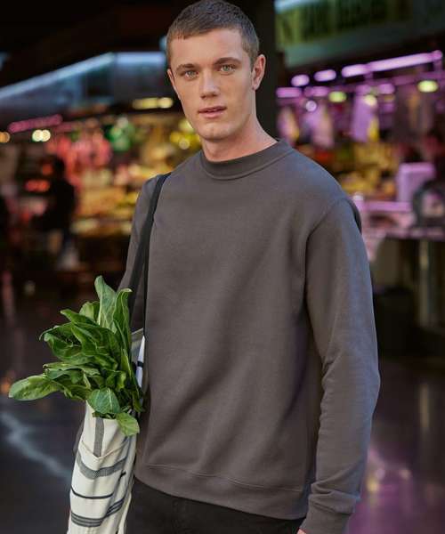 Crew neck sweatshirt. Collar, cuffs and bottom hem in 1x1 rib with Elastane. Topstitching flatlock on shoulders, armholes and bottom hemline. Modern cut. Tubular construction.