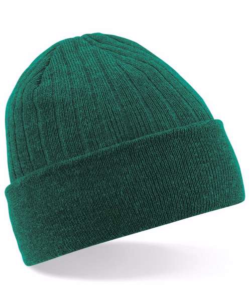 Thinsulate™ lining. Non-ribbed turn up for easy decoration. Double layer knit.