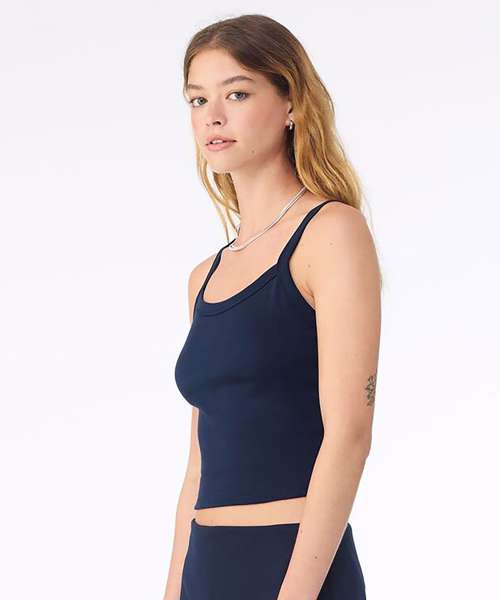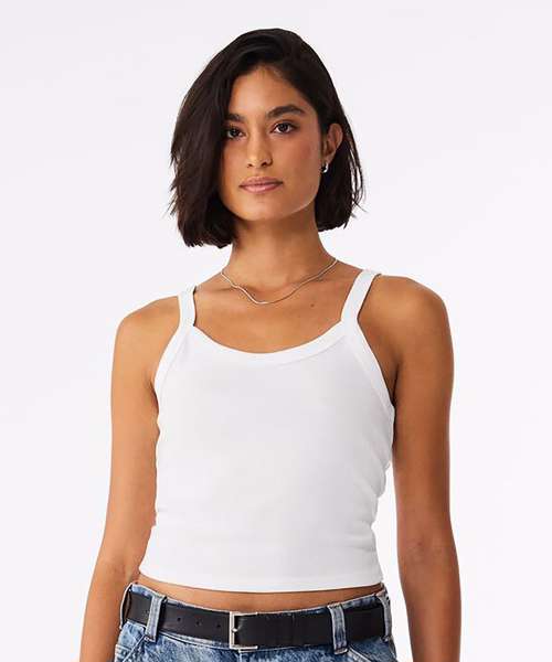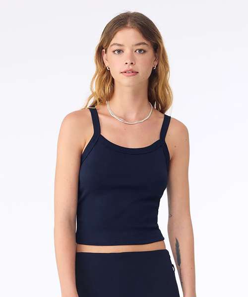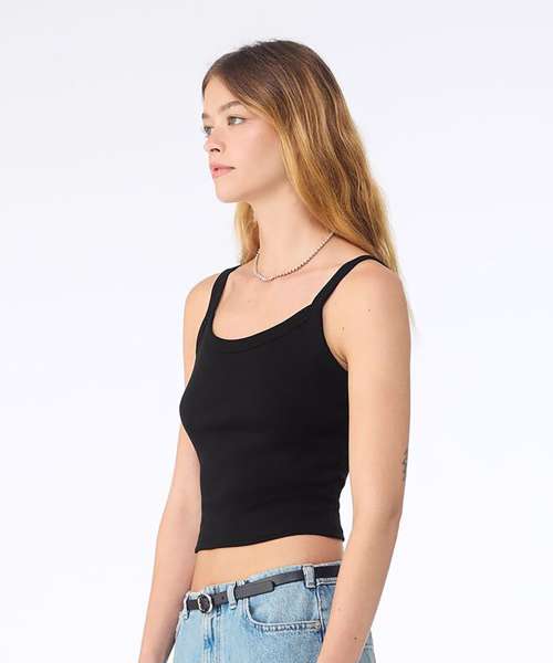 Thick spaghetti straps. Mid-length. 1x1 micro rib. Fitted. Stretch fit. Pre-shrunk. Side-seamed.