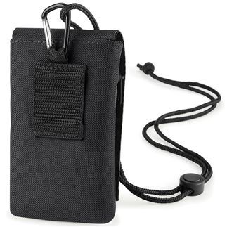 Smartphone compatible. Rip-Strip™ closure. Zippered pocket. Detachable neck cord with toggle. Belt loop and carabiner clip.