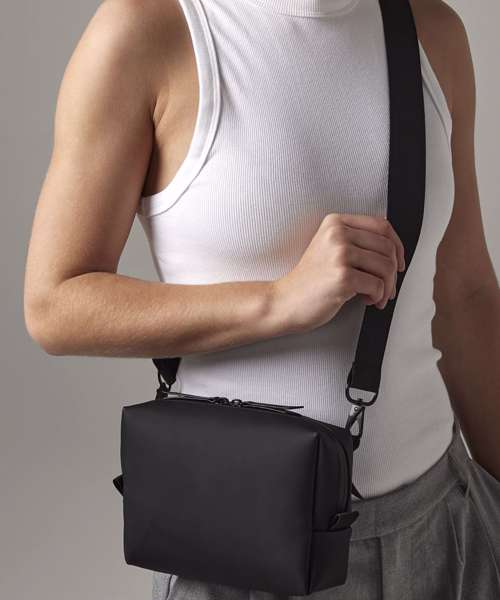 Water-repellent fabric. Minimalist styling. Two-way zipped opening for easy access. Zipped rear pocket. Internal mesh pocket. Rubberised zips. Detachable, adjustable shoulder strap. Adjustable webbing shoulder strap. TearAway label for ease of rebranding. Handle length: 124cm. 100% Recycled polyester.