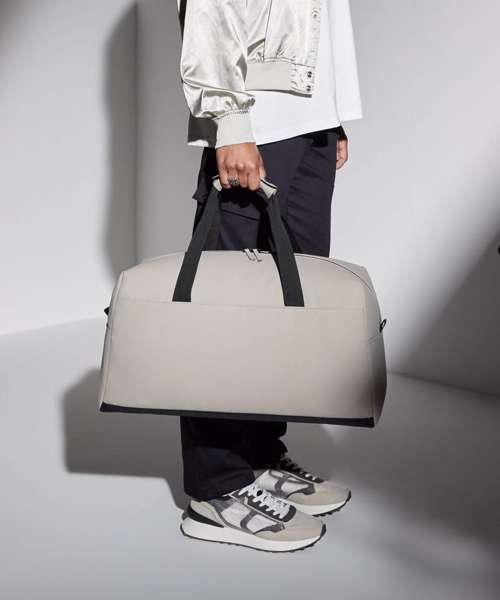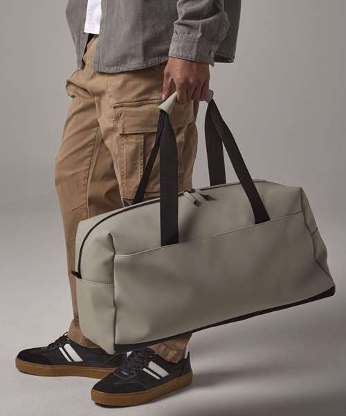 100% Recycled polyester with matte-look PU coating. PVC-free. Water-repellent fabric. Minimalist styling. Extra-long main compartment zip for easy access. Zipped internal valuables pocket. Double-layer base panel for durability. Self-fabric handle wrap. Webbing carry handles. Can be carried by hand or over the shoulder. TearAway label for easy rebranding.