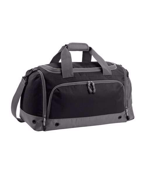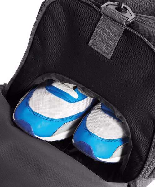 TearAway label for ease of rebranding. Water-resistant fabric. Detachable adjustable shoulder strap with pad. Shoe tunnel. Wet pocket. Internal valuables pocket. External mesh pocket. Zippered end pockets. Protective base feet. Metal ventilation eyelets. Padded hand grip.