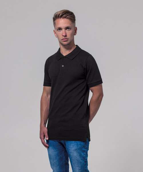 Fitted polo piqué . Neutral size label without branding, neck print possible. Set-in sleeves. Herringbone neck tape, herringbone tape inside the side slots at the hem and inside the inner button facing. Double seams at the hem. Rib collar. Three tonal dtm buttons.