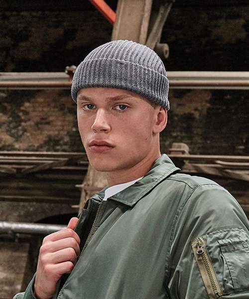 100% Recycled polyester fabric. Folded brim. Fisherman beanie.