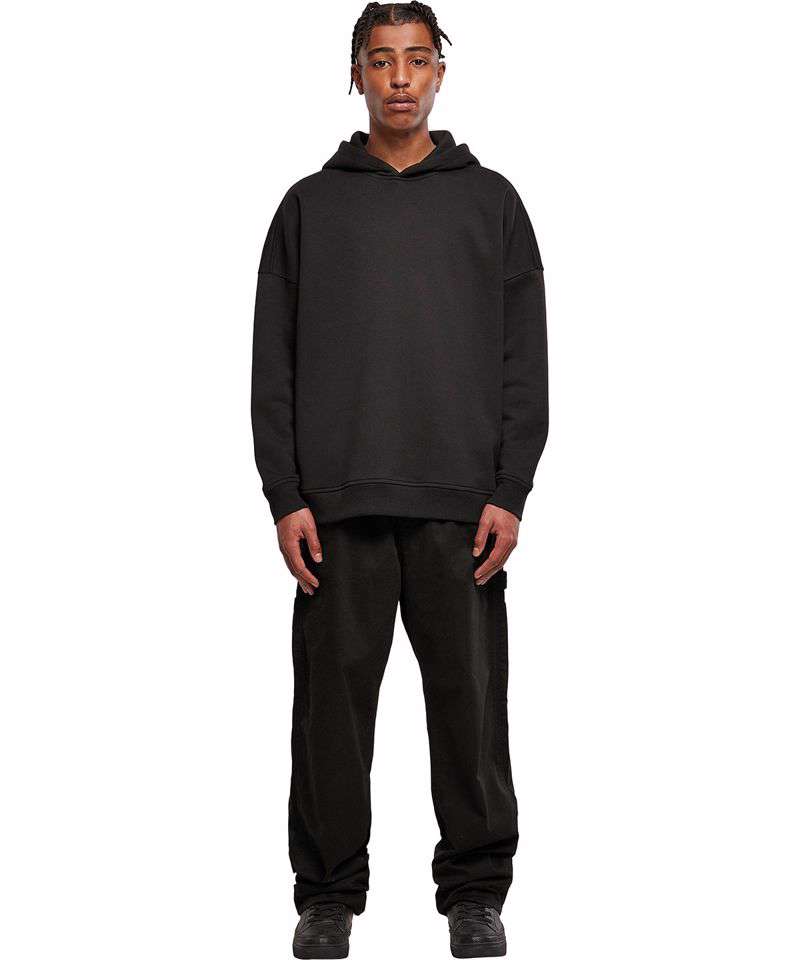 A relaxed men’s hoodie in a trendy oversized cut and with dropped shoulders, its hood is crossed at the centre front, creating a distinctive effect. It also features wide, classic rib cuffs and hem, and can be personalised with printing or embroidery. The material is a comfy mix of cotton and polyester.