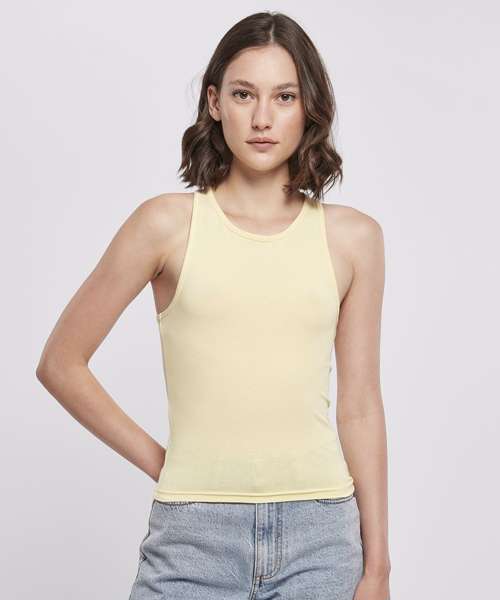Equipped with a dynamic, sporty racerback cut, the otherwise plain, single-coloured women’s top sets a style statement. This women’s top offers a high crew neck on the front, while the cut is slim fit and the length is kept short. A pleasant wear is ensured by a material mix of cotton and elastane. The summery style can be individually refined further, either by flock or screen printing or with embroidery.