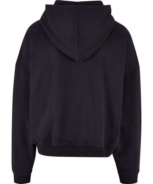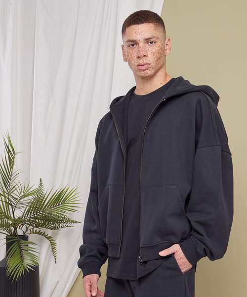 Presenting an oversized fit with heavily dropped shoulders, an extra-large hood and a divided kangaroo pocket, this men’s zip hoodie is a homage to the vibe of the 90s. The style is completed by wide rib cuffs on the sleeves and hem. Made from heavy cotton terry, it can further be refined with screen or flex printing.