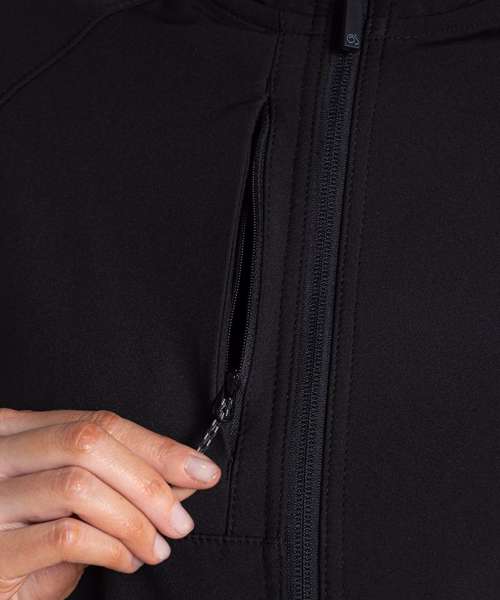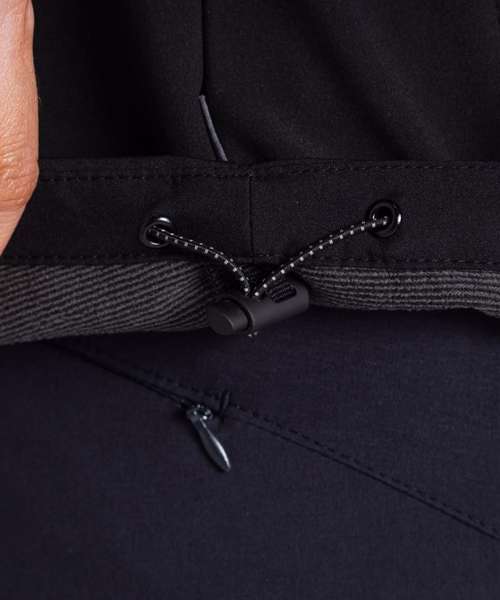 Water-resistant and windproof softshell jacket with 3 pockets. Recycled polyester elastane softshell with EcoShield DWR finish. Striped microfleece back and recycled zip tapes.