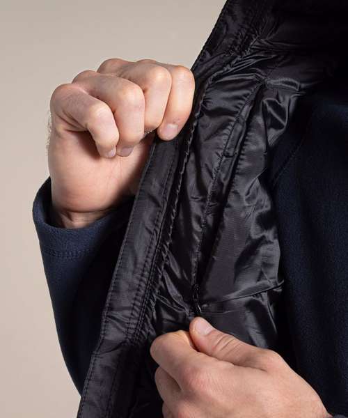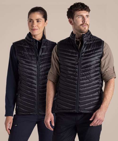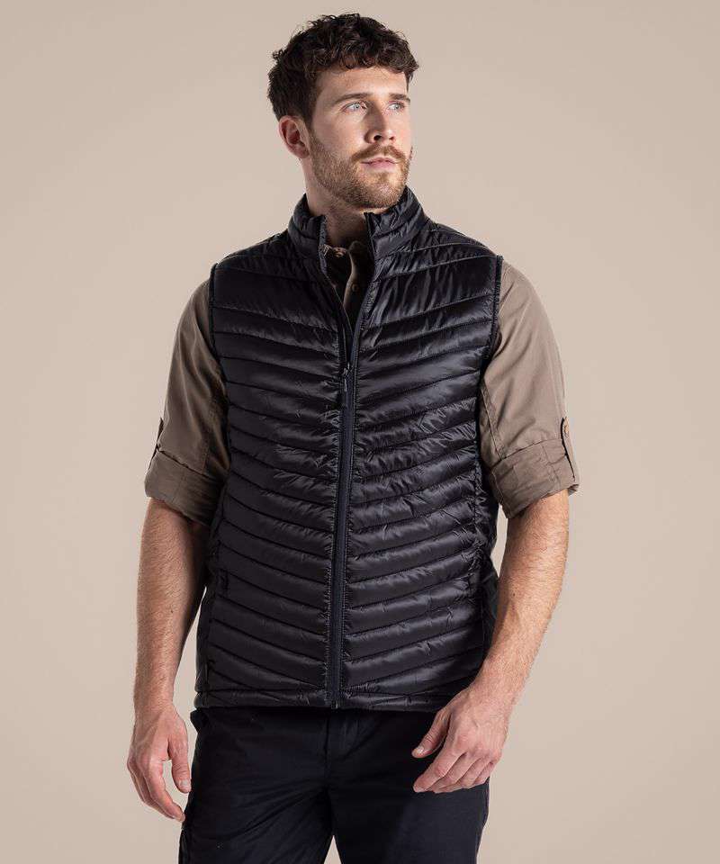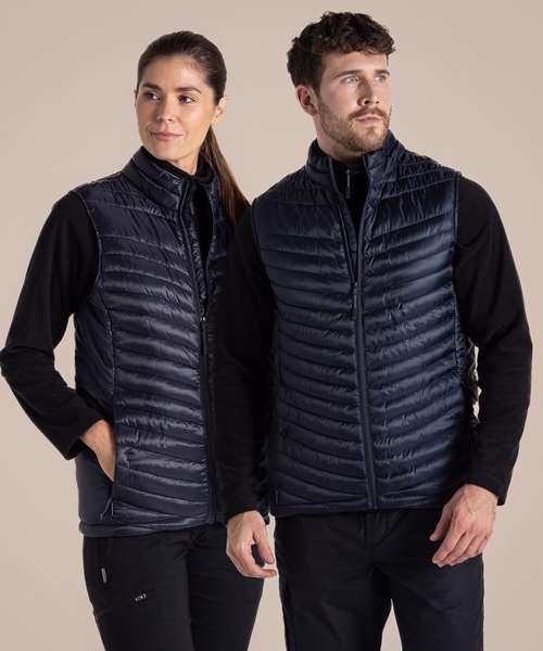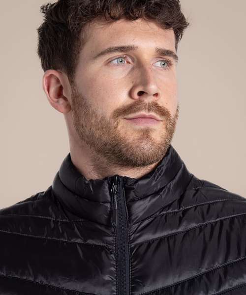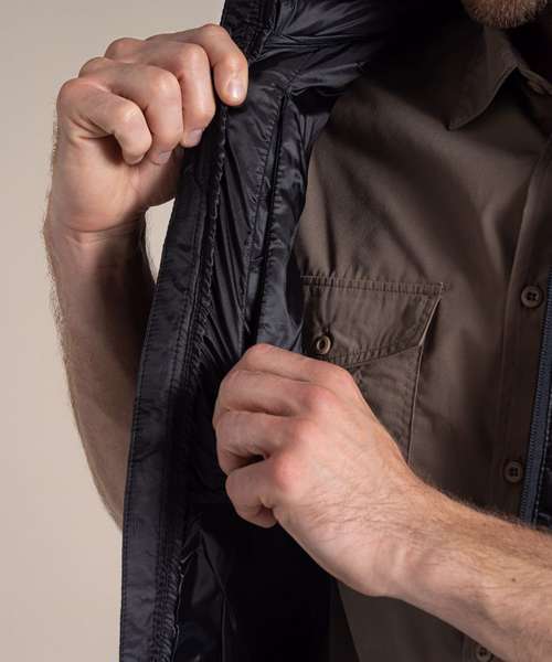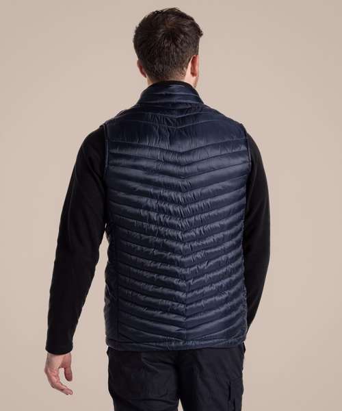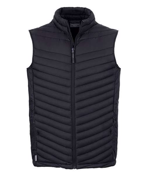 Water-resistant padded vest, with a full-length zip and 4 pockets, one of which doubles as a stow pocket. Recycled polyester mini ripstop with EcoShield DWR finish outer and lining. ThermoPro recycled polyester fill and recycled zip tapes. 4 pockets: 2 welted zipped lower, 1 concealed zipped inner and 1 passport RFID.