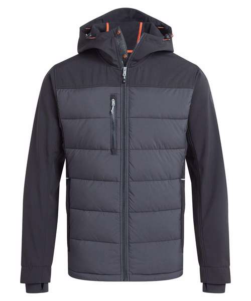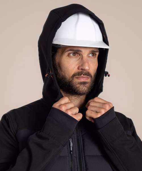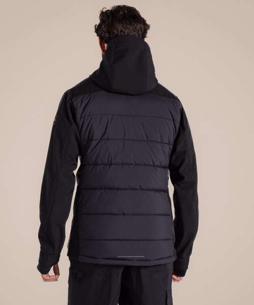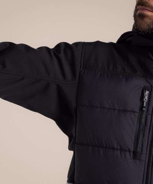 Part-recycled polyester elastane softshell with microfleece back and H2OShield DWR finish to upper body and hood. Part-recycled polyester ripstop to front and back body with H2OShield DWR finish, recycled polyester hollowfibre fill and recycled zip tapes.