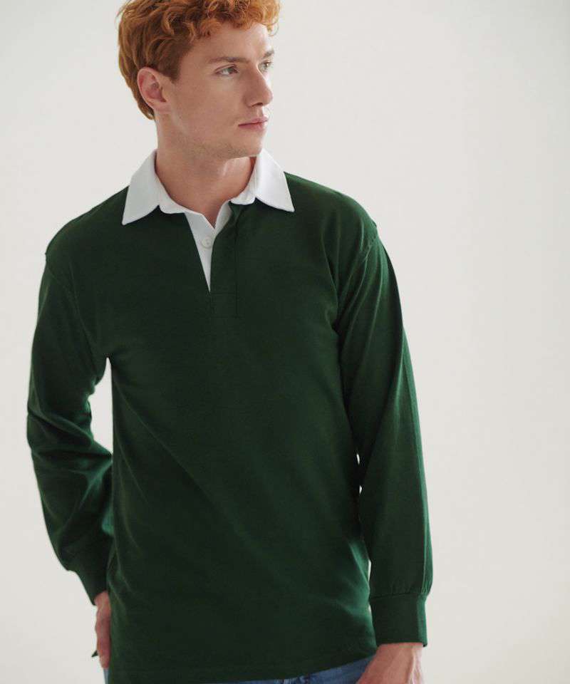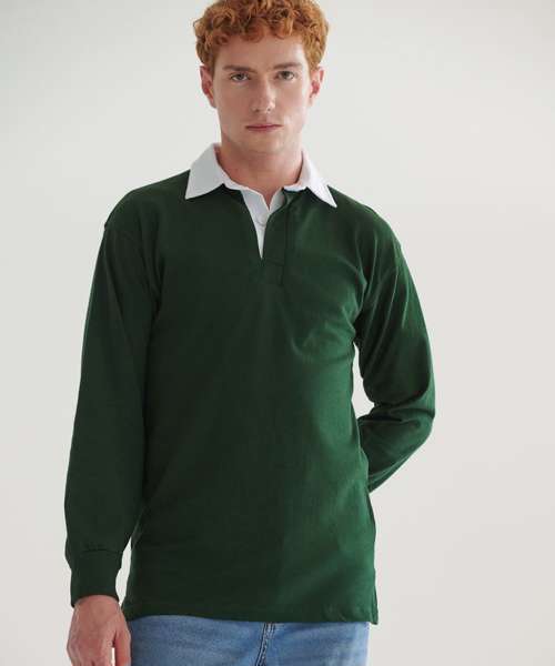 Taped shoulders and self-fabric facing on side vents, rubber buttons. Elastane re-inforced cuffs for shape retention. Twin-needle hems and traditional woven rugby collar with cotton webbing. Rugby leisurewear garments are for leisure use only.