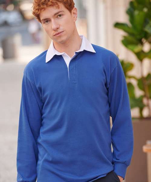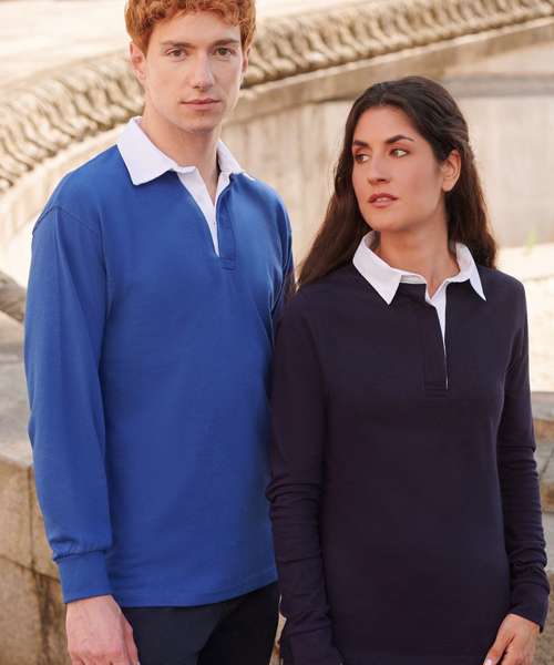 Self fabric taped side vents. Elastane reinforced cuffs for shape retention. Twin-needle hems. Traditional rugby collar with cotton webbing. Dyed to match plastic buttons. Rugby leisurewear garments are for leisure use only.