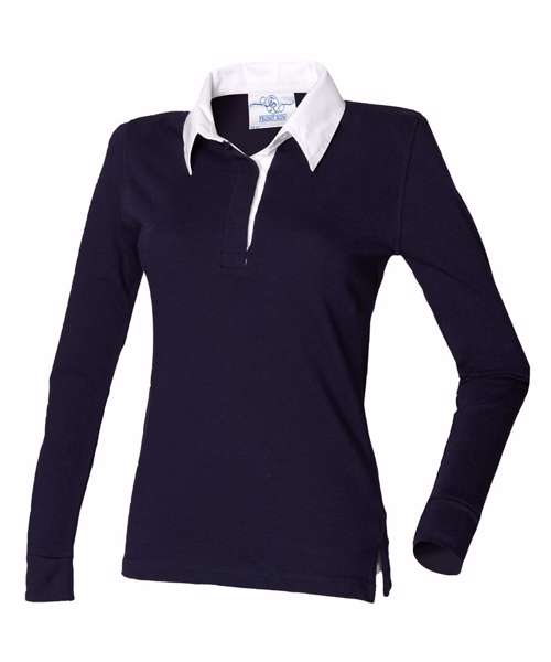 Self-fabric facing on side vents. Elastane reinforced cuffs for shape retention. Twin-needle hems and traditional rugby collar with cotton webbing. Slimmer feminine fit. Dyed to match plastic buttons. Rugby leisurewear garments are for leisure use only.