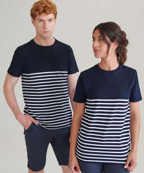 Tag free regular fit, heavyweight short sleeved t-shirt. Crew neck with stretch ribbed neckline. Twin-needle stitching at cuffs and hem. 'V' flatlock stitching detail at neck. Flatlock stitching at neck, shoulder seam and armholes. High chest seam. Striped lower body; contrast plain upper body and sleeves. Coordinates with FR134 long sleeved Breton T.