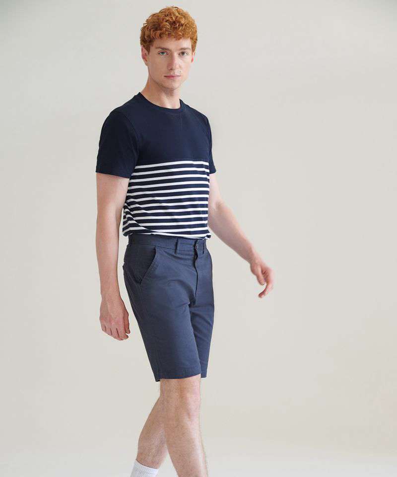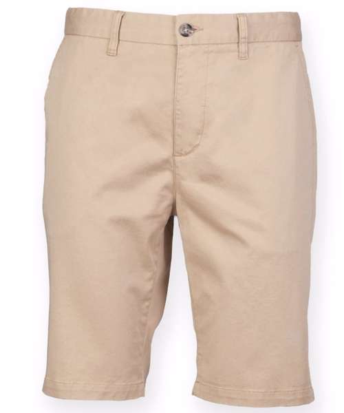 Flat front chino short, tag free, stretch fabric for ease of movement. Slanted front pockets, 2 back welt pockets, belt loops plain hem.