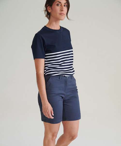 Flat front chino short. Tag free. Stretch fabric for ease of movement. Slanted front pockets. 2 x back welt pockets. Belt loops. Plain hem.