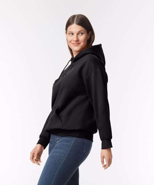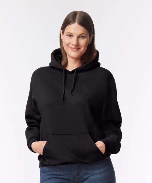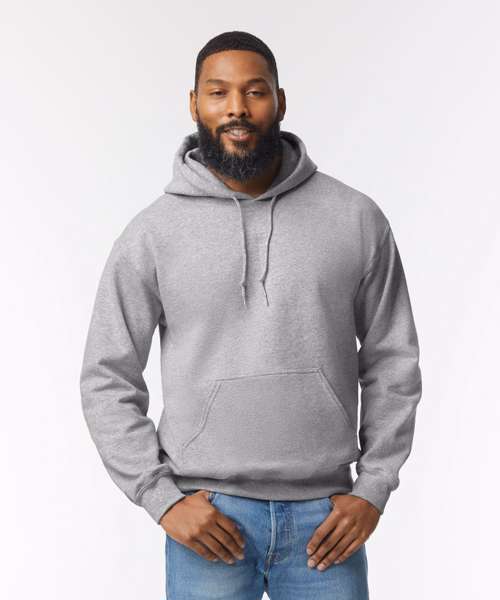 Air jet yarn; softer feel and no pilling. DryBlend® wicking performance. Double lined hood with matching drawstring. Tearaway label. Twin needle stitching. Pouch pocket. Twin needle cuffs. 1x1 rib with elastane. Quarter turned to eleminate centre crease. Please note safety colours are for leisure purposes only.