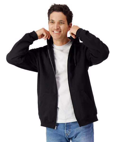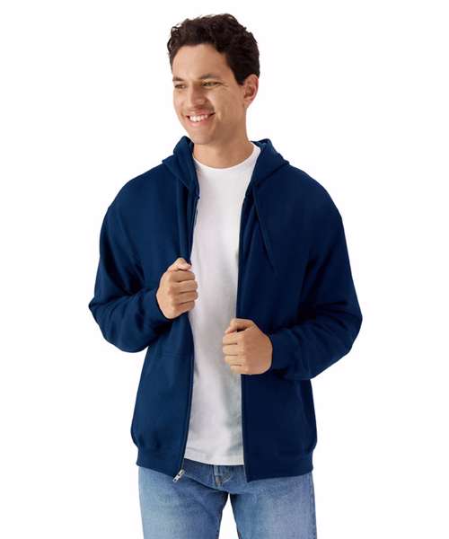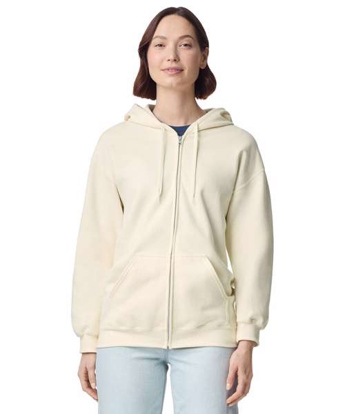 Made with a soft ringspun cotton blend, the Softstyle™ midweight fleece adult full-zip hooded sweatshirt features a cosy, brushed interior with a 100% cotton face, ideal for DTG printing. Two-end ringspun cotton-face fleece. Two-piece, colour-matched, Jersey fabric-lined hood. Dropped shoulder. Pouch pocket. 1x1 rib with elastene cuffs and bottom band for enhanced stretch and recovery. Classic fit, tubular body. High-performing black tear-away label.