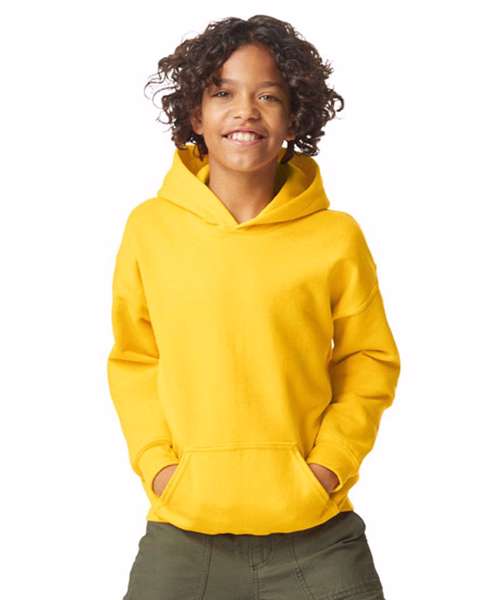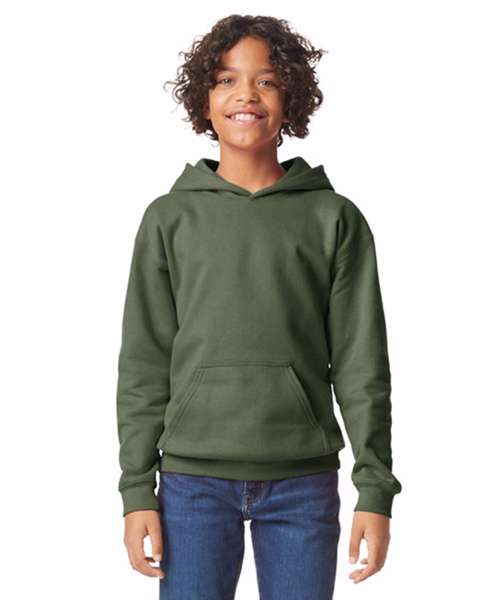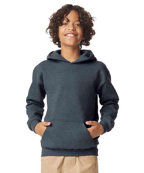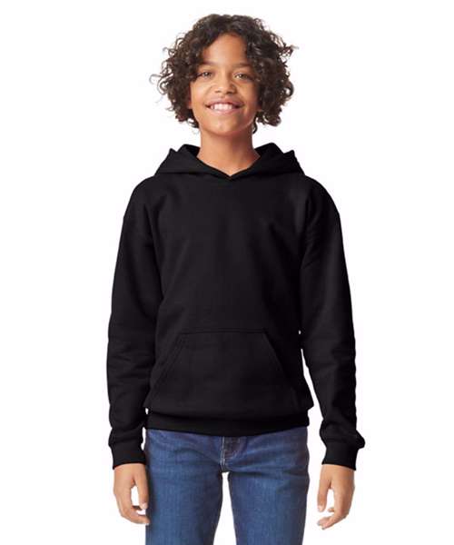 Made with a soft ringspun cotton blend, the Softstyle™ midweight fleece youth hoodie features a cosy, brushed interior with a 100% cotton face, ideal for DTG printing. Two-end ringspun cotton-face fleece. Two-piece, colour-matched, Jersey fabric-lined hood, no drawcord. Dropped shoulder. Pouch pocket. 1x1 rib with elastene cuffs and bottom band for enhanced stretch and recovery. Classic fit, tubular body. High-performing black tear-away label. CPSIA label tracking compliant.