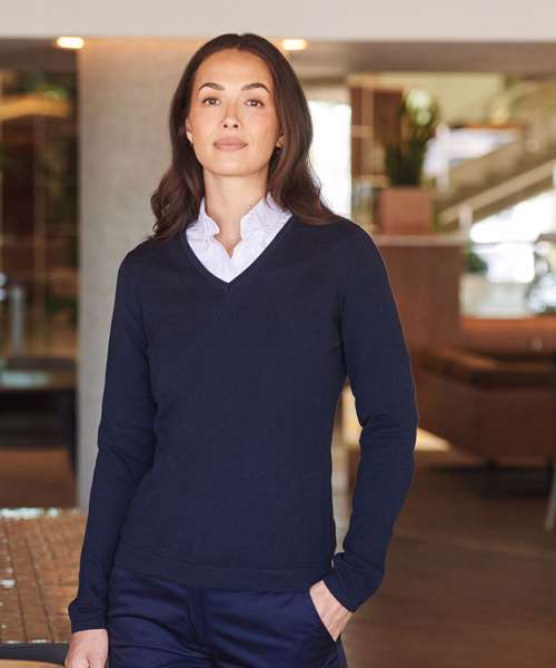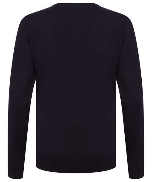 Fine knit 12 gauge v-neck jumper. Tube knit waist and cuff. Semi fashioned sleeve and neck detail.