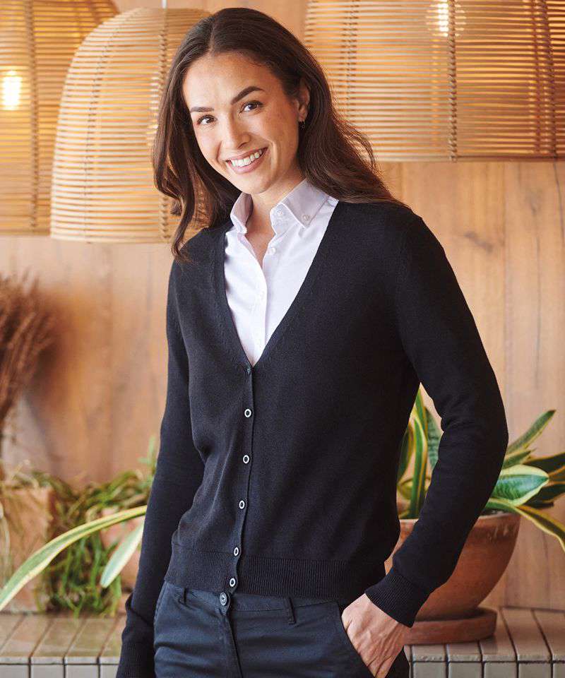 Fine knit 12 gauge short length cardigan. Semi-fashioned sleeve and neck detail. Self-coloured pearlised buttons. Set in sleeves. 1x1 neck rib, hem and cuffs. Co-ordinates with Men’s HB720, HB724, HB725 and Women's HB721. Henbury cut-out brand label.