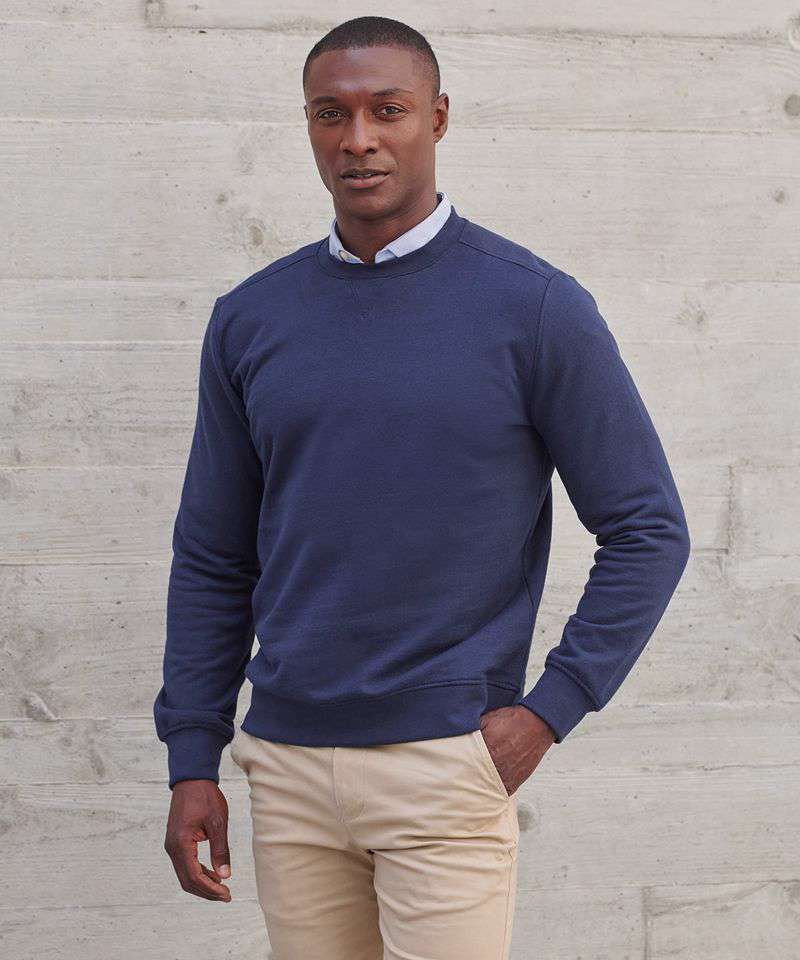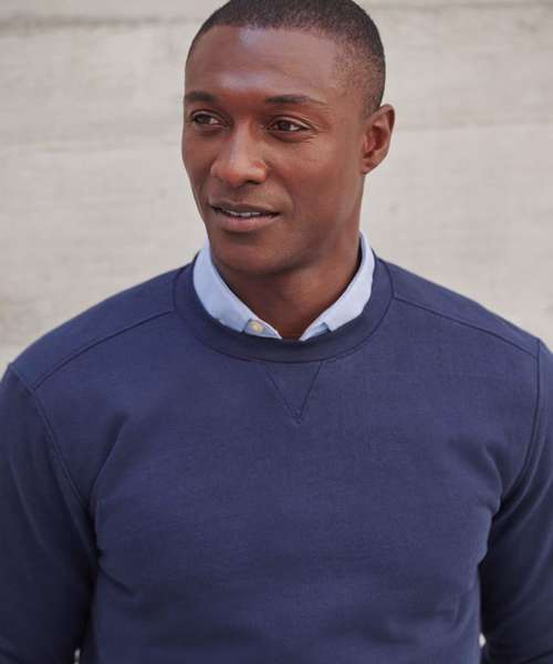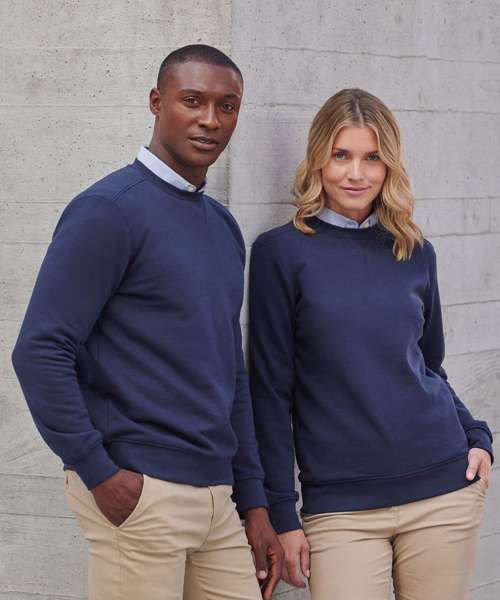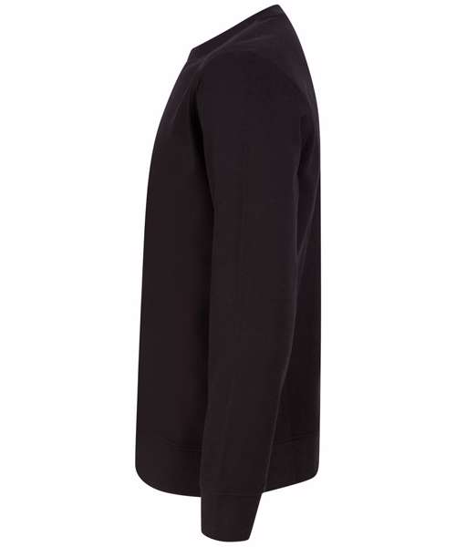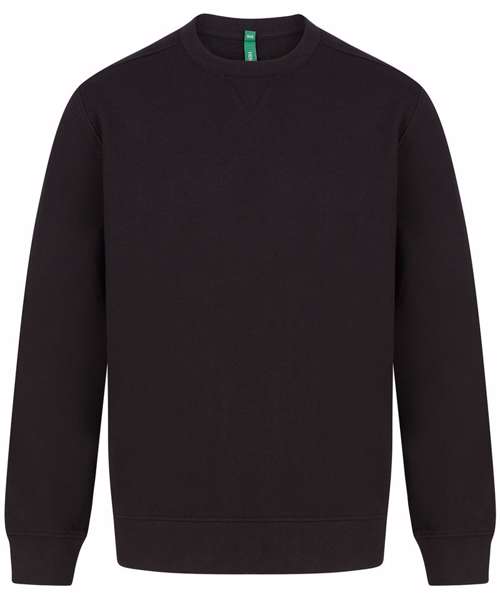 Fabric using recycled materials. Regenerated cotton mixed with recycled polyester. Brush back fleece. Set-in sleeves. Ribbed cuffs and hemline. V insert at neckline. Back neck tape. Regular fit. Henbury cut-out label for easy rebranding.