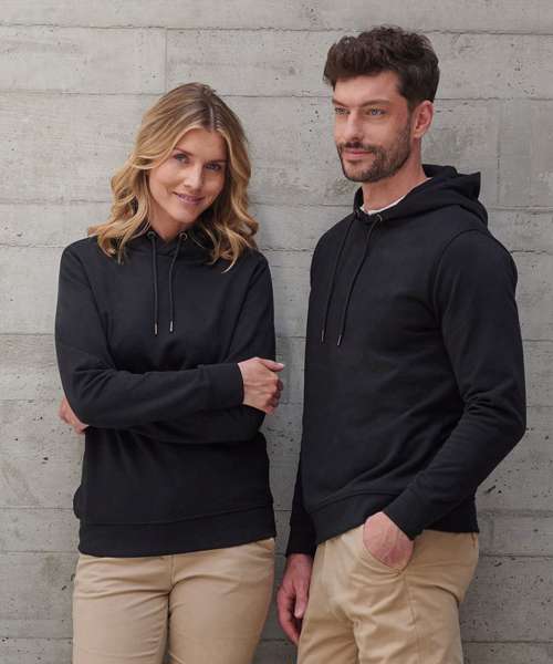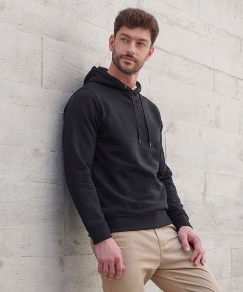 Fabric using recycled materials. Regenerated cotton mixed with recycled polyester. Brush back fleece. Set-in sleeves. 3-piece hood with drawcord and metal ends. Ribbed cuff and hemline. V insert at neckline. Regular fit. Henbury cut-out label for easy rebranding.