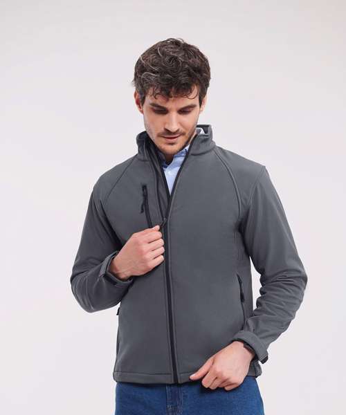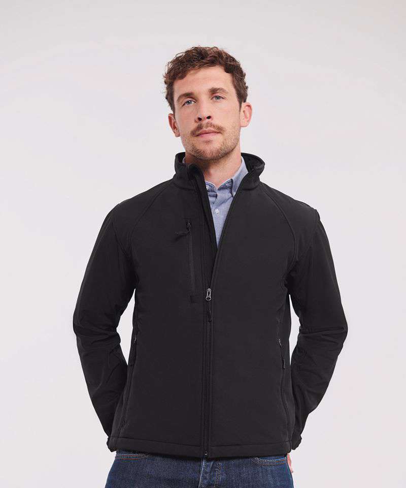 3 layer softshell fabric with breathable membrane and bonded microfleece lining, water resistant to 5000mm. Side pockets and chest pocket with inner lining, reversed zip and cord pulls. Full zip with inner storm flap and zip neck protector at collar. Bungee cord in hem. Adjustable cuffs. Drop tail. Large left chest side decoration access. Fully launderable at 40°C.