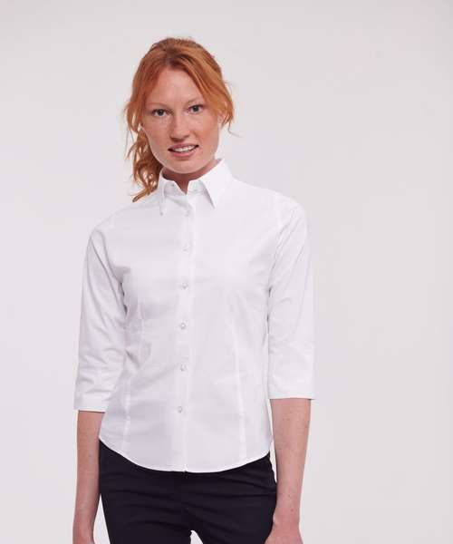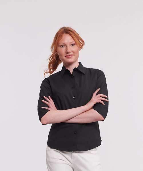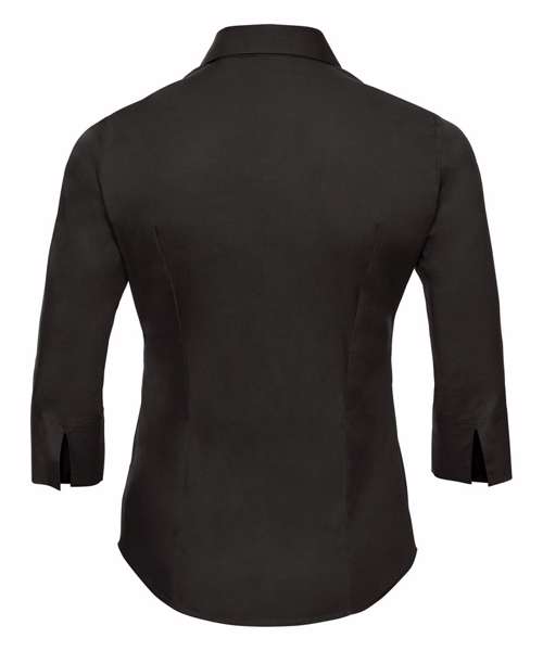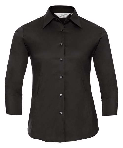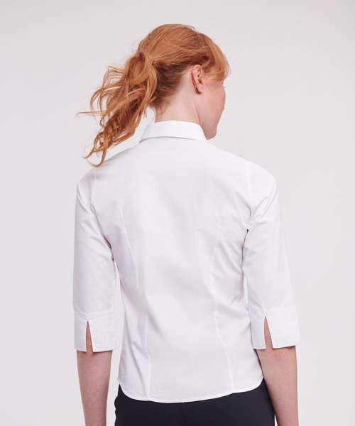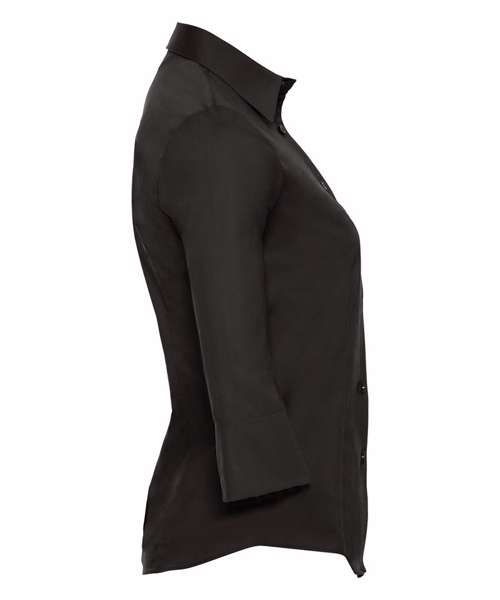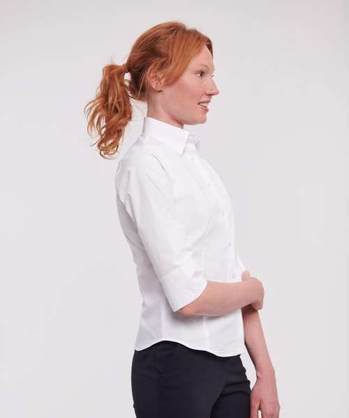 Fitted cut and contemporary design make this style the right choice wherever a modern appearance is required. Smooth fabric with a slight stretch for added comfort and fit. Classic single button collar. Stylish elbow-length 3/4 sleeve with split cuff. Darts on back panel and on front hem, for fitted ladies' shape. Rounded hem.