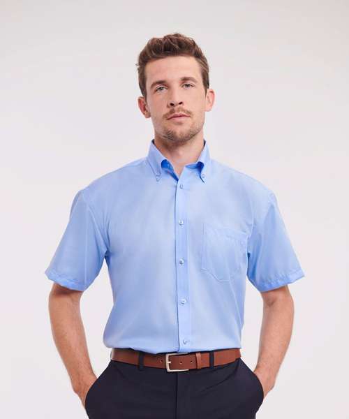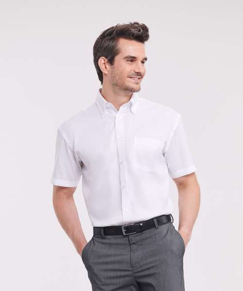 Made using the newest technologies of non-iron fabric that stays wrinkle free and keeps the wearer looking and feeling smart all day long. The classic gents shirt cut with semi-cut away button down collar and chest pocket. Back yoke with two pleats. Rounded hem.