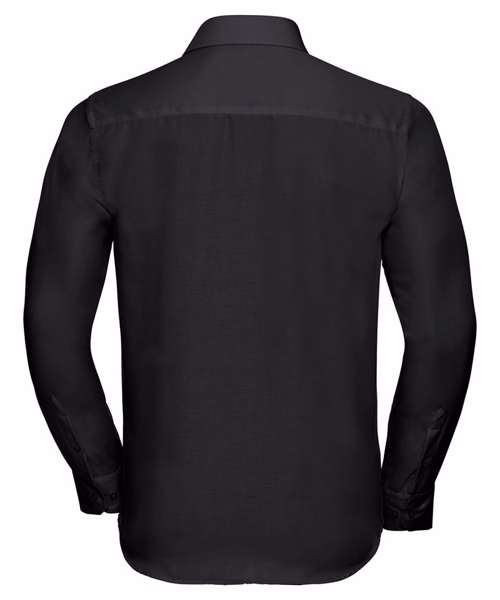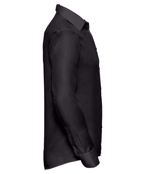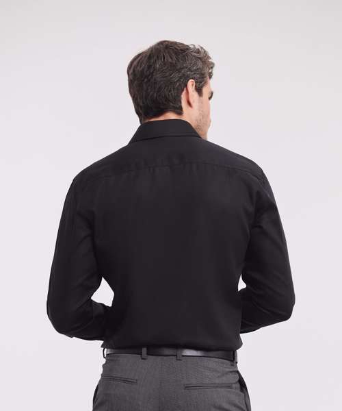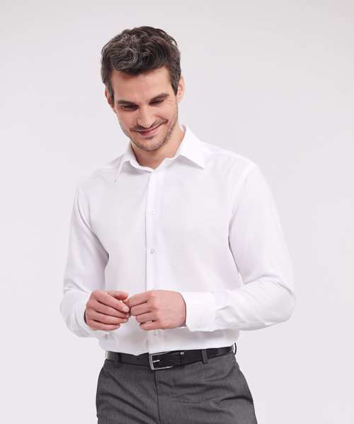 Made from a new type of non-iron fabric that stays wrinkle free and keeps the wearer looking smart all day long. Contemporary tailored cut with modern stiffened, semi- cut away boned collar. Mitred cuff, adjustable with two buttons and with option for cuff links. Without chest pocket. Rounded hem.