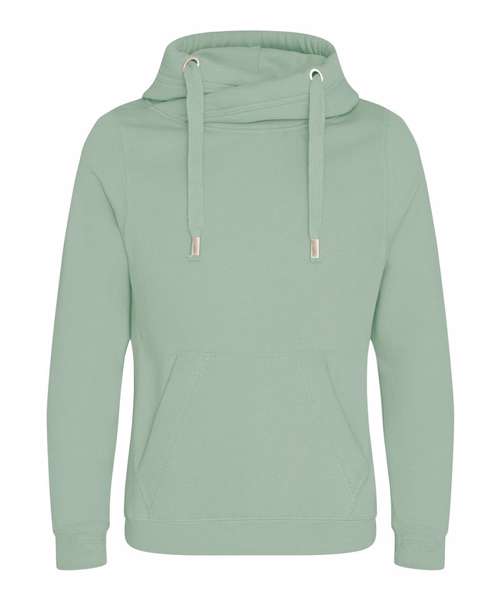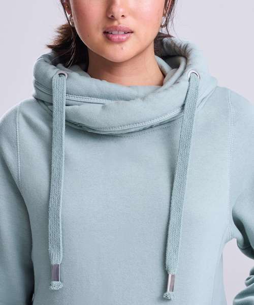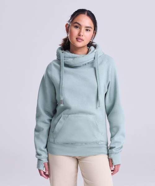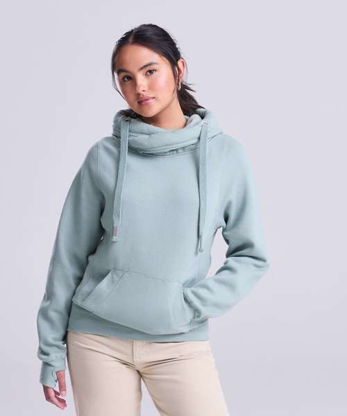 Heavyweight hoodie. Cross over neck detail. Twin needle stitching detail. Three panel double fabric hood. Flat lace drawcords. Kangaroo pouch pockets. Ribbed cuffs and hem. Soft cotton faced fabric created ideal printing surface. Simple tear out label makes it perfect for rebranding. Brushed inner fleece. Thumb holes in the cuffs.