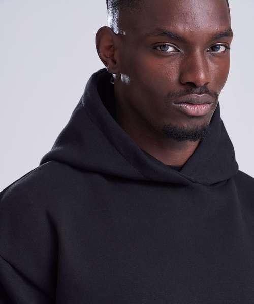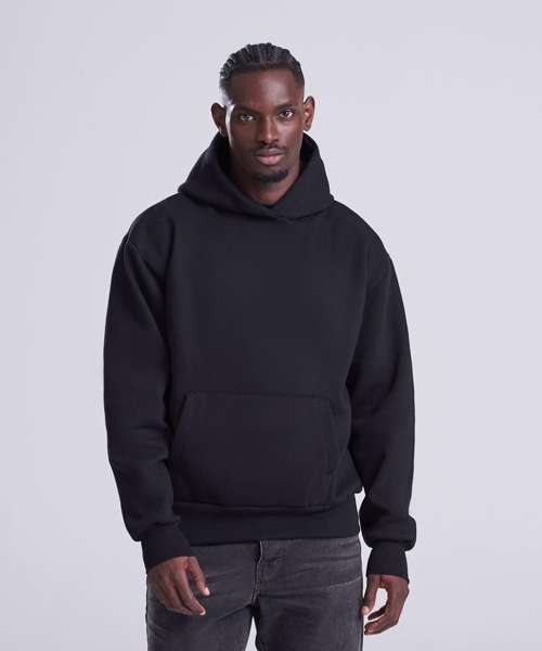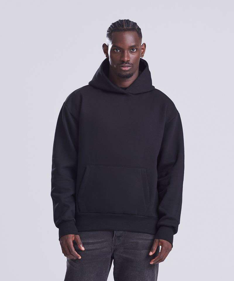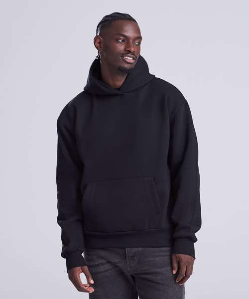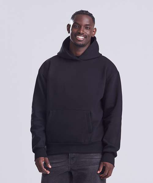 Oversized fit. Heavyweight. Three-panel, double-fabric hood. Kangaroo pouch pocket with inner phone pocket. No drawcords. Ribbed cuff and hem. Brushed inner fleece. Tear-away label. 100% cotton-faced hood.