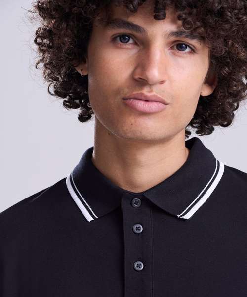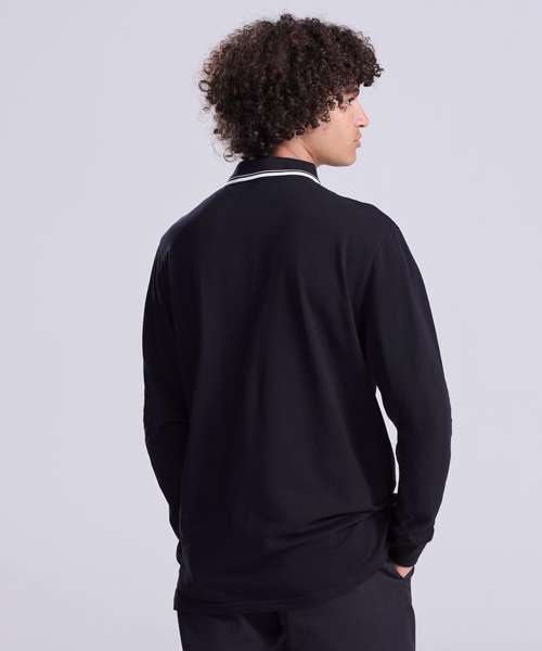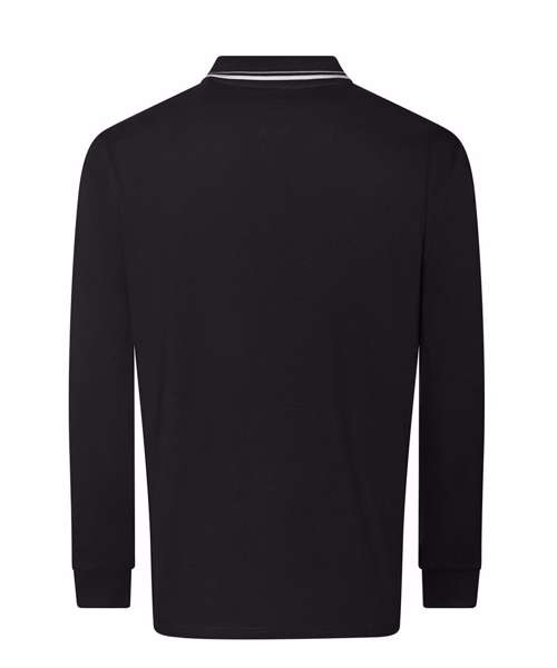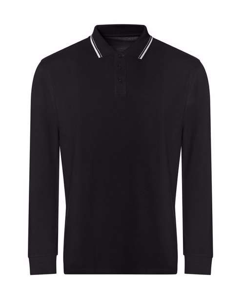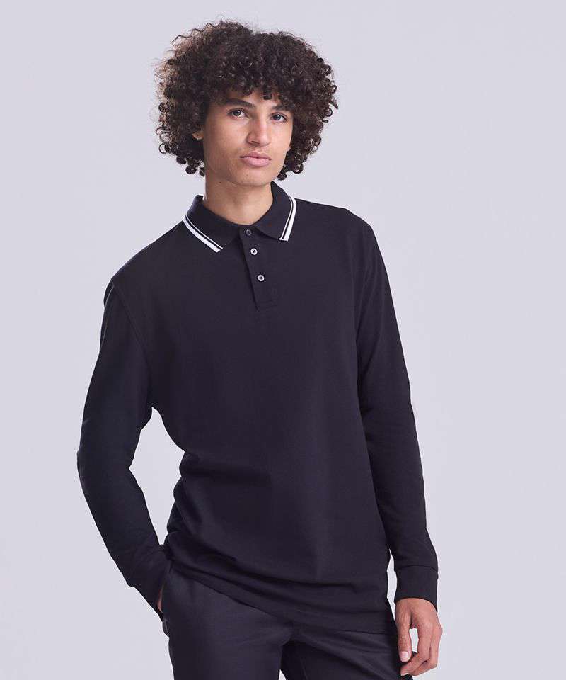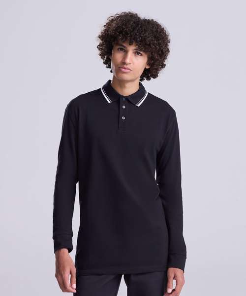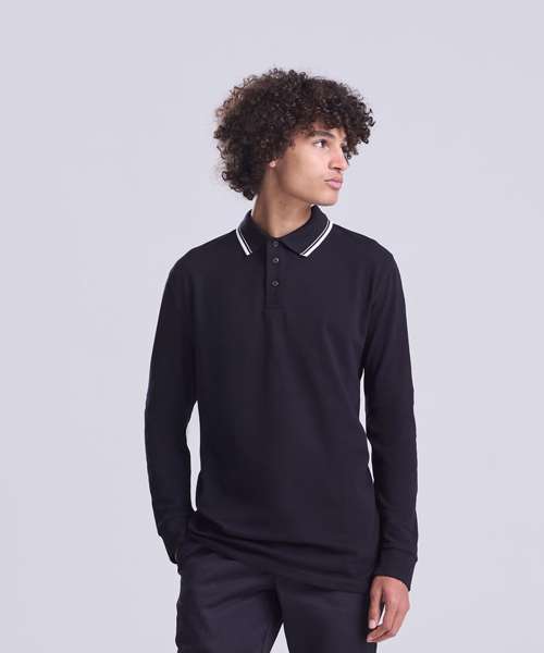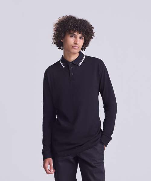 Modern and stylish fit. Contrasting tipping on collar. Three- button placket with dyed-to-match buttons and spare button. Size label only, for easy rebranding– colour coded black for unisex. Cuffed sleeves. 1x1 ribbed flat collar. Excellent surface for print or embroidery. Taped neck. Long sleeves. Twin-needle stitching detail on armhole and bottom hem.