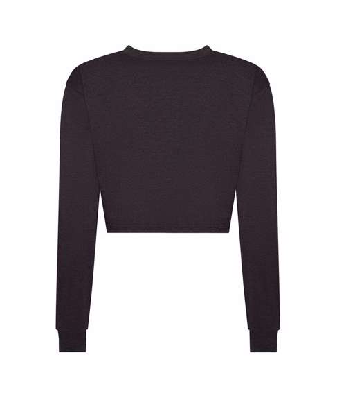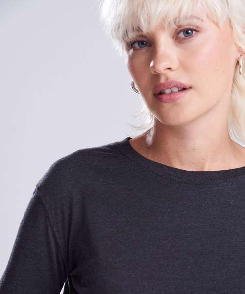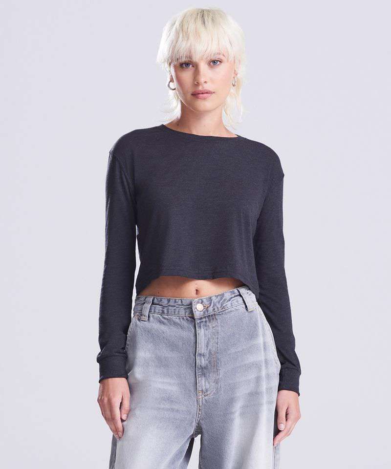 Cropped women’s fit with side seams. Long sleeves with cuffs. Size label only, for easy rebranding – colour-coded white for women. Triblend fabric for style and comfort. Surface excellent for print or embroidery. Ribbed crew neck style, with taped neck. Twin-needle stitching detail on sleeve and bottom hem.