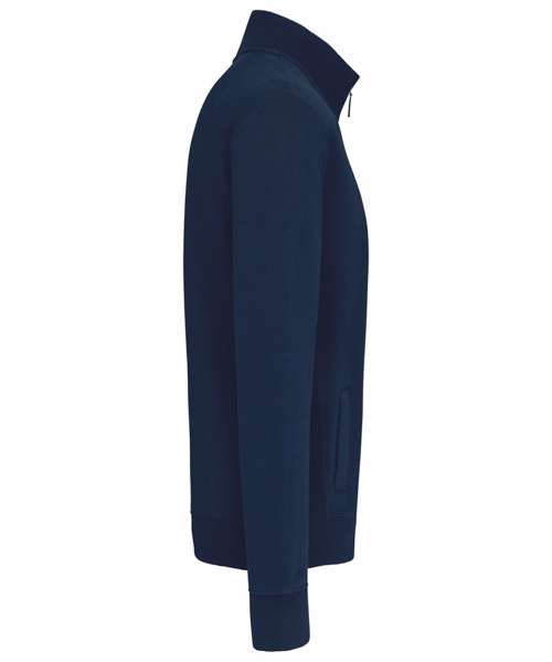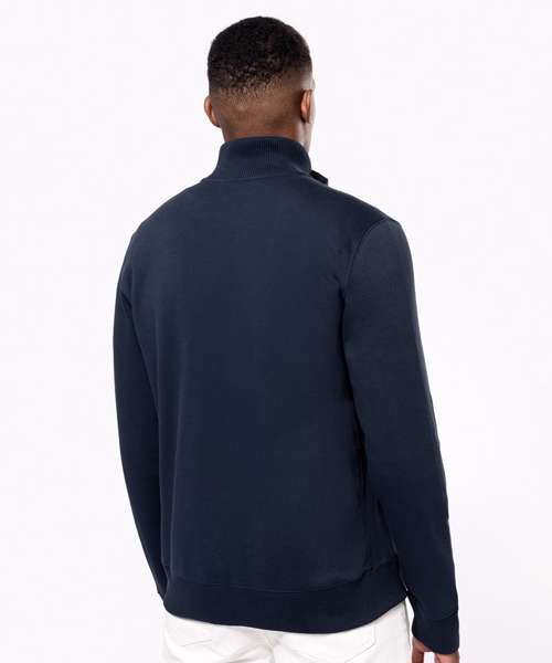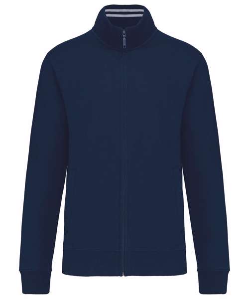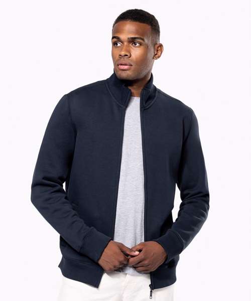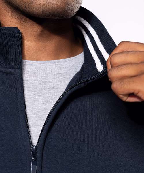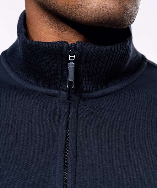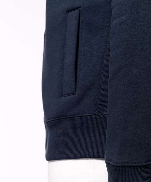 80% combed cotton / 20% polyester. Low shrinkage brushed fleece. Silicone wash. Fitted style with ribbed side panels. matching neck tape (except for White body where neck tape is Oxford Grey). Contrast striped ribbed inner collar. 2 front pockets. Ribbed cuffs and hem. Zip. BSCI certified. Oeko-Tex certified. WRAP certified.