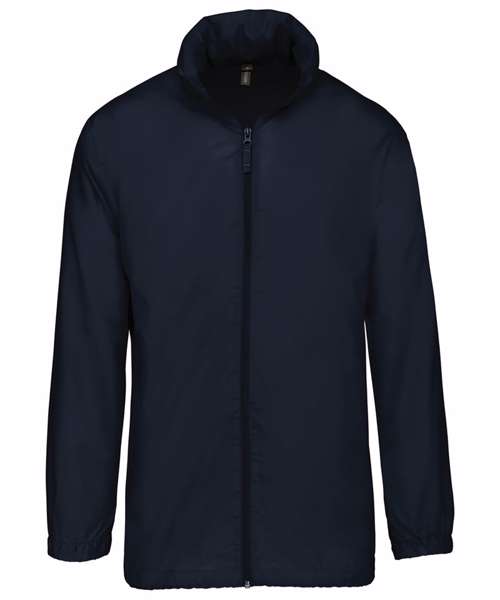 100% polyester. Concealed hood with tear release fastening tab. 2 front zipped pockets. Drawstring at bottom. Elasticated cuffs. Packs/zips into front pocket. Matching full front zip.