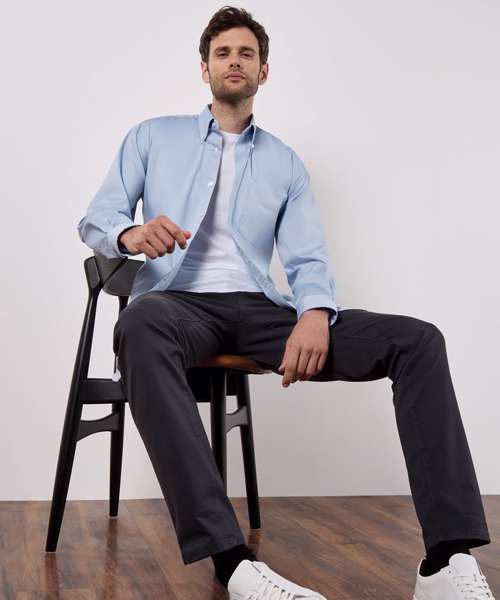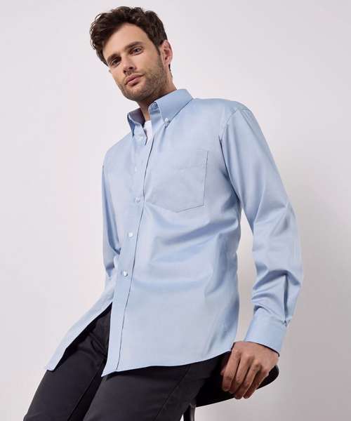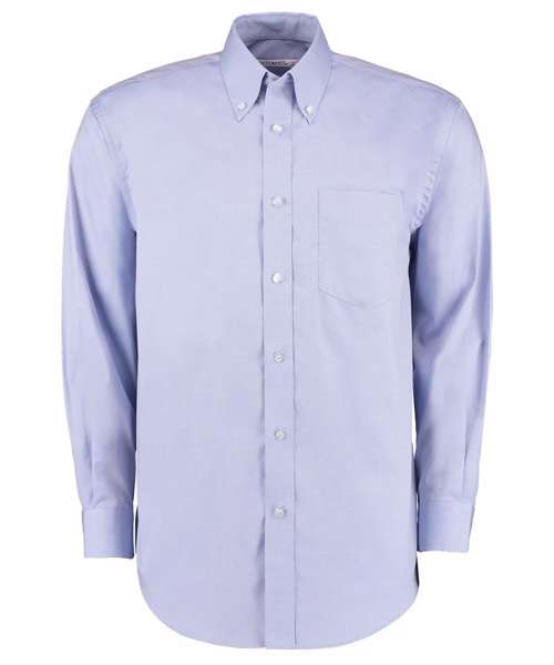 Fused stand-up button down collar. Central back pleat. Rounded hem. Chest pocket to left side as worn. 1-button adjustable cuff with 1-button cuff placket. Double-stitched side and sleeve seams. Spare buttons. Kustom Kit® woven back neck label.