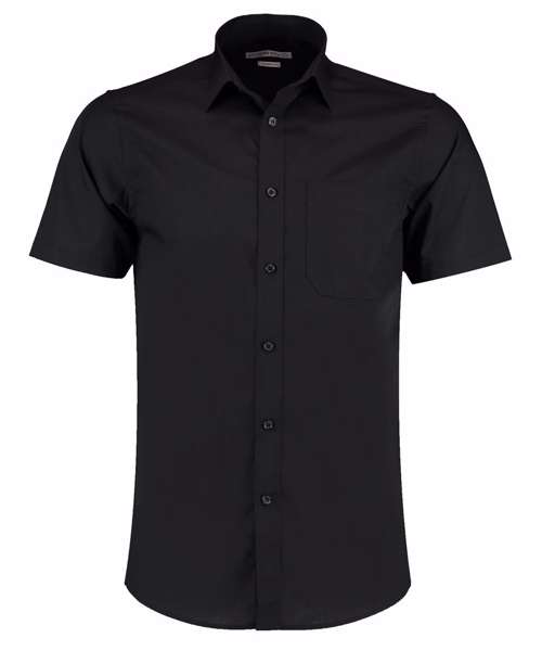 Fused semi cutaway collar. 7-button placket with self-coloured buttons. Rounded hem. back yoke. Single stitching around armholes. Double-stitched sleeves and side seams. Patch pocket with angled corners to left chest as worn. Spare button. Kustom Kit® woven back neck label.