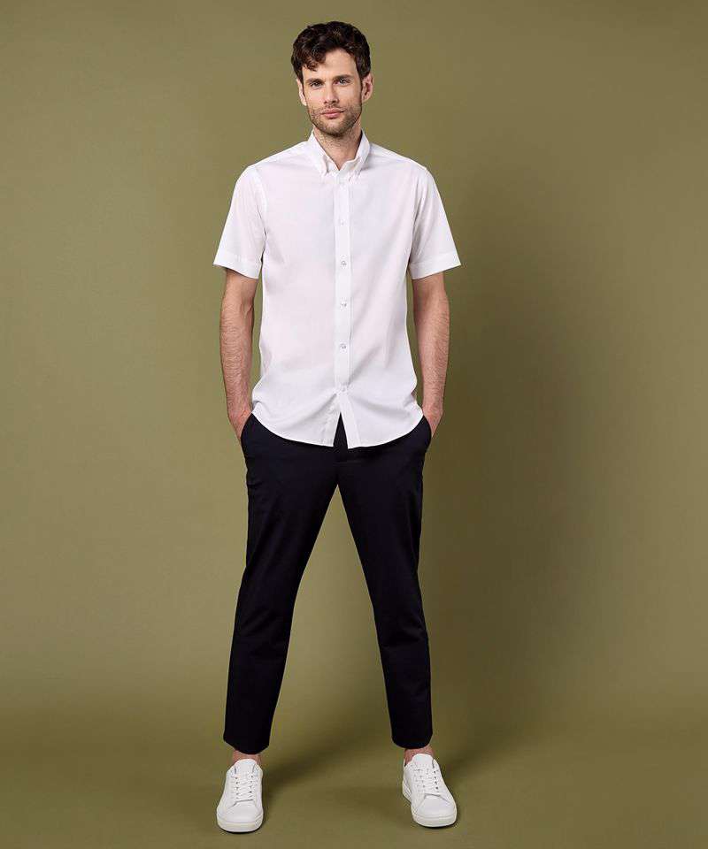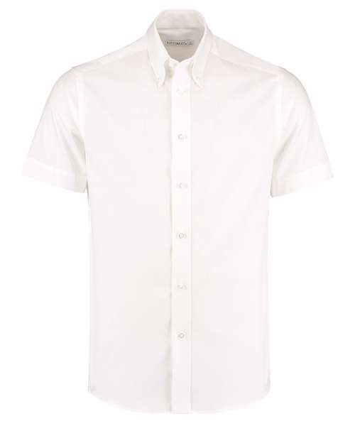 Fused stand-up button-down collar. Rounded hem. Back yoke. Single-stitched cuffs. Single-stitched yoke and armhole seams. Double-stitched side and sleeve seams. Spare buttons. Kustom Kit® woven back neck label.