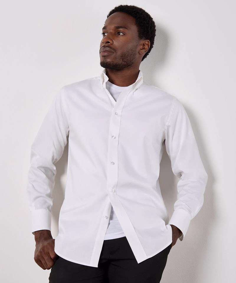 Fused stand-up button-down collar. Rounded hem. Back yoke. Two button cuff with one button pointed cuff placket. Single-stitched cuffs. Single-stitched yoke and armhole seams. Double-stitched side and sleeve seams. Spare buttons. Kustom Kit® woven back neck label.