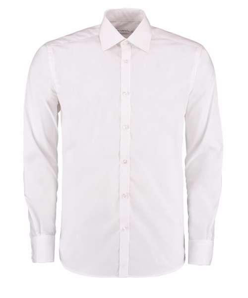 Easy care fabric. Fused stand-up semi cutaway collar. Rounded hem. Back yoke. Two-button cuff with buttoned point cuff placket. Two darts at back. Single needle stitching around armholes. Double-stitched sleeve and side seams. Spare button. Kustom Kit® woven back neck label.