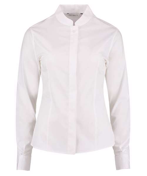 Soft fused mandarin collar. Easy iron. Concealed placket. Rounded hem. Single-stitched front and back yoke and armholes. Double-stitched side and sleeve seams. Two darts to front. Two darts to back. 1-button adjustable cuff with button cuff placket. Spare button. Kustom Kit® woven back neck label.