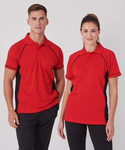 Coolplus® fibres and yarns enabling moisture transportation (wicking), breathability and also quick dry properties. Pique polo shirt with contrast panelling and piping on side panels. Contrast piping on raglan and cuffs. Raglan sleeves for extra freedom of movement. 2 button placket with (plain) ribbed collar.