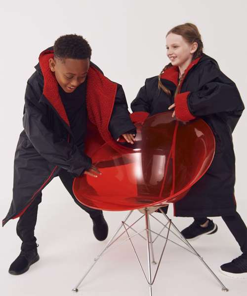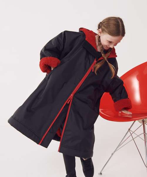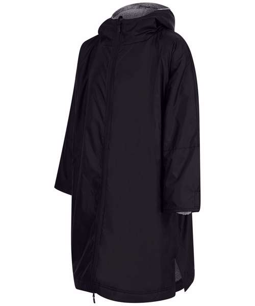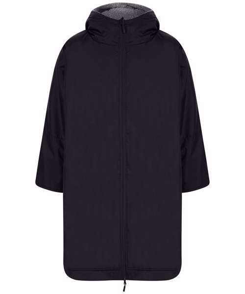 Water-resistant robe with sherpa fleece lining and a three-piece hood. Full double-ended zip down centre front. Zipped pockets with fleece lining. Inner zipped pocket with water-resistant lining. Inner embroidery access zip. Hook and loop fastening at wrist. Side vents.